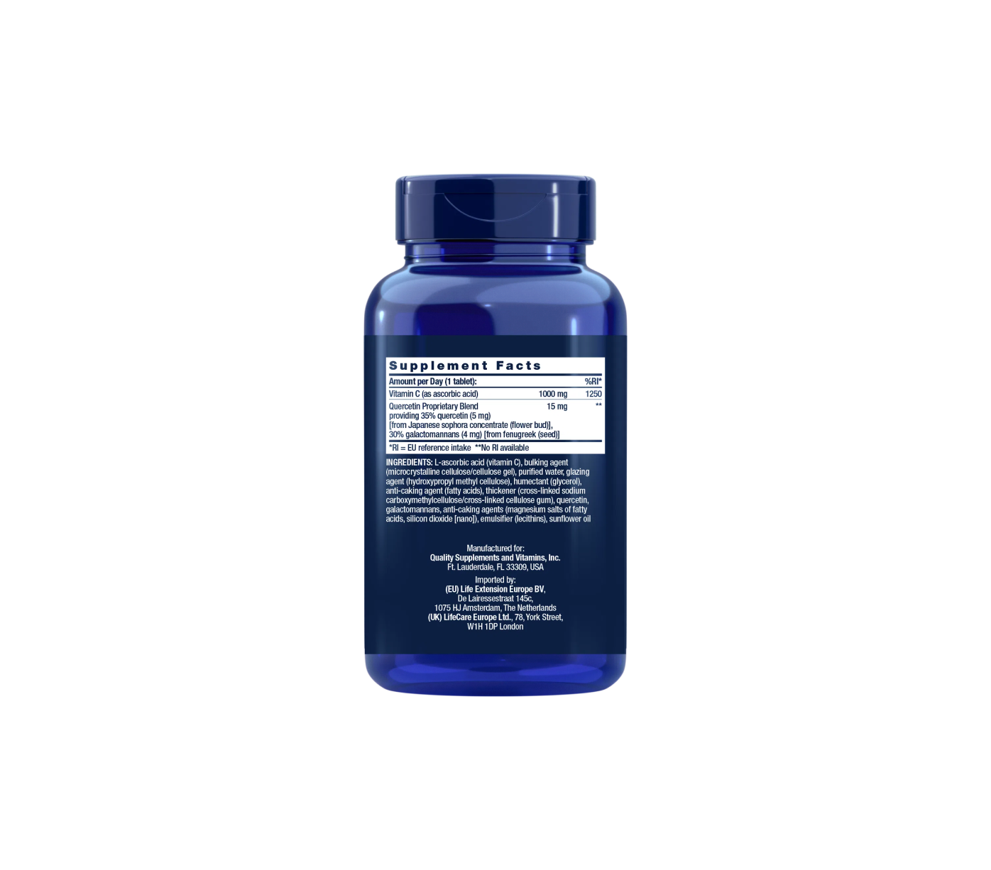 Vitamin C ist ein essentieller Nährstoff, den der Mensch nicht selbst herstellen kann. Diese Formel kombiniert hochdosiertes Vitamin C mit Bio-Quercetin, einer ultra-absorbierbaren Form des Antioxidans Quercetin. Diese Verbindungen schützen Ihren Körper vor oxidativem Stress, fördern die Kollagenbildung, unterstützen eine gesunde Immunfunktion und die Eisenaufnahme.